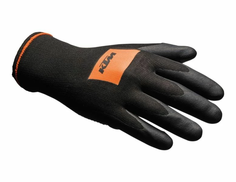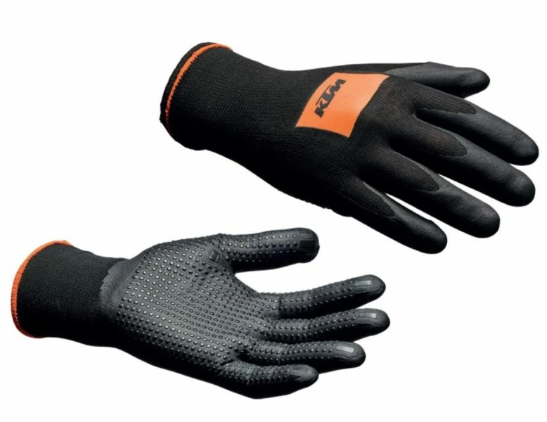 “Ready to Race” – for KTM, these three words are far more than a simple slogan. They stand for the company philosophy of developing vehicles that can, without any modifications, comprehensively assert themselves in any race. Direct from the dealer onto the track and into the battle for victory. These are tough work gloves with rubber coating for even better grip. Includes a snug fit, ribbed cuff, and printed KTM Racing logo.